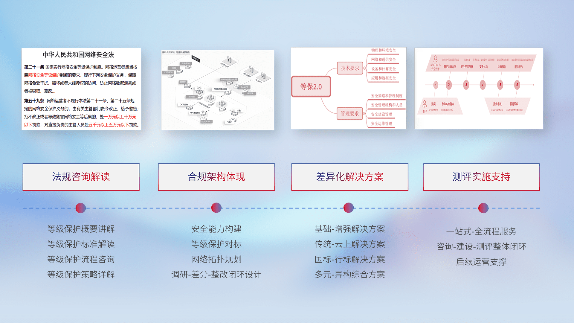 通过专业的法律咨询解读、、、、合规架构体现、、、差异化解决方案、、、、测试实施支持等服务,,,为客户量身打造等保合规体系。。